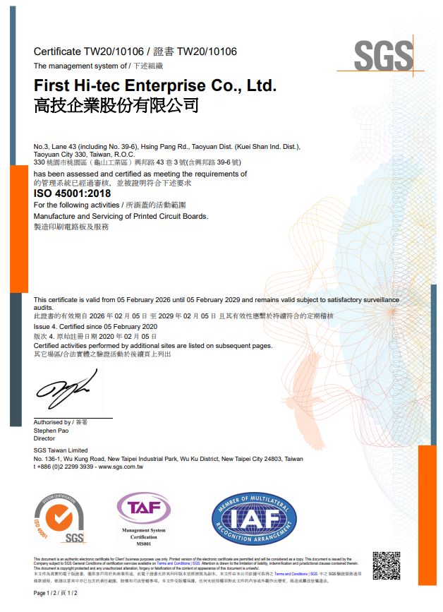 通過ISO 45001:2018年版職業安全衛生管理系統SGS認證 |